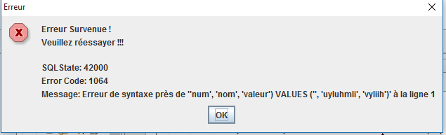 JOptionPane.showMessageDialog(this,"Erreur Survennue! \n Veillez Ressayer !!!");