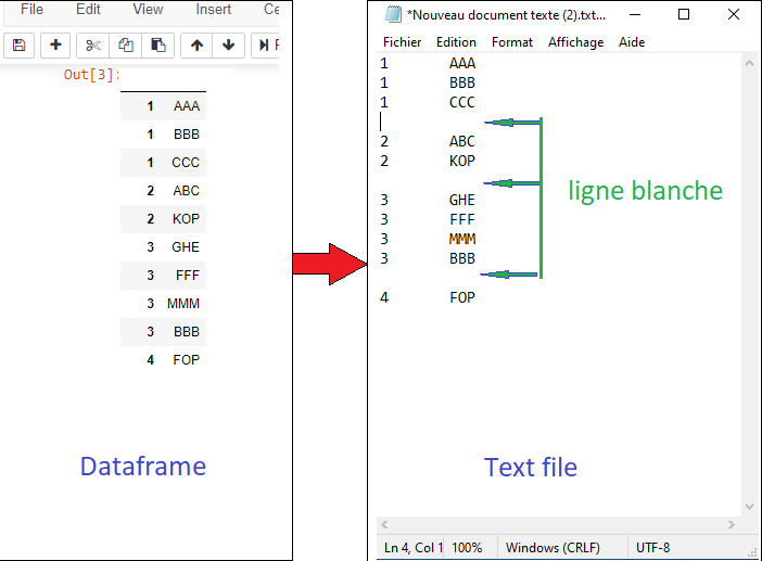 jai un pandas dataframe et je cherche comment export cette dataframe vers text file selon le format dans l'image ci-dessous