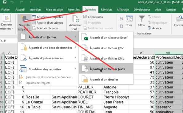 Je te remercie de l’énorme travail que tu as produit mais je pensais que ta réponse me permettrait d’appliquer moi-même le traitement adéquat à mes autres feuilles de données (j’en ai 21, qui contiennent entre 1 et 282 actes) mais en fait tu m’as livré le travail tout fait. Je n’avais pas l’intention de te confier un mandat d’exécution mais d’obtenir des explications qui me permettraient de m’en charger moi-même. En gros je pensais apprendre à pêcher et tu me livres le poisson tout prêt !
